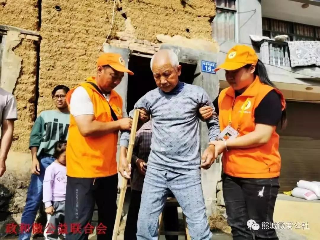 2019年10月10日,政和微公益聯(lián)合會(huì)成員摻扶著受災(zāi)村民吳良進(jìn)常年癱瘓的老父親,幫助他活動(dòng)筋骨 政和文明辦供圖