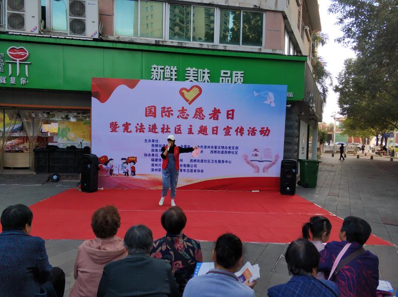 西橋街道聯(lián)合漳州市委文明辦、閩南日?qǐng)?bào)社、漳州職業(yè)技術(shù)學(xué)院等多家單位黨員志愿者,舉辦“國(guó)際志愿者日暨憲法進(jìn)社區(qū)主題日”活動(dòng)?;顒?dòng)內(nèi)容有:文藝演出、憲法知識(shí)現(xiàn)場(chǎng)有獎(jiǎng)問(wèn)答、憲法法律法規(guī)咨詢(xún)、分發(fā)憲法讀物等。在“憲法宣傳周”期間,西橋街道各社區(qū)也紛紛行動(dòng)起來(lái),在轄區(qū)多個(gè)公共區(qū)域張貼、懸掛憲法宣傳標(biāo)語(yǔ),出制憲法宣傳欄,在轄區(qū)單位、物業(yè)小區(qū)、沿街商家店鋪的電子顯示屏上循環(huán)播放憲法公益廣告,邀請(qǐng)專(zhuān)家進(jìn)社區(qū)講憲法,多角度普及憲法相關(guān)知識(shí)。