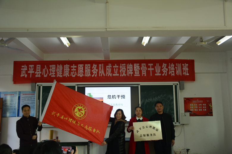 文明風12月9日訊 為做好社會心理服務(wù)體系建設(shè)試點工作,努力建設(shè)更高水平的平安武平,健康武平,不斷提升武平縣心理健康服務(wù)人員的思想和業(yè)務(wù)能力,12月6日上午,在武平一中現(xiàn)代教學中心舉行武平縣心理健康志愿服務(wù)隊揭牌和授旗儀式與武平縣心理健康志愿服務(wù)隊骨干業(yè)務(wù)培訓。會議由武平縣教育局副局長翁汀輝主持,武平縣委文明辦副主任蘭為金、武平縣教育局政教股長蘭仁友,全縣各中學、中心校專兼職心理健康教師參加會議。