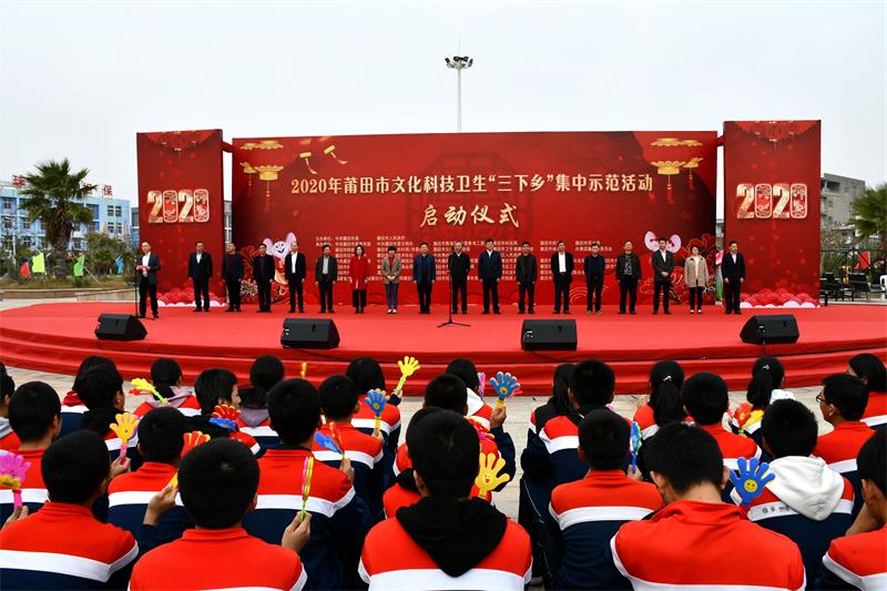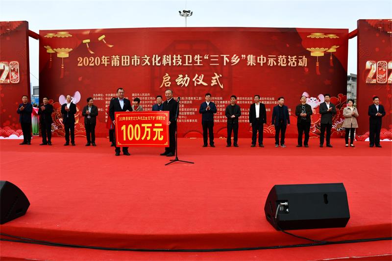 文明風(fēng)1月13日訊 1月10日上午,秀嶼區(qū)東嶠鎮(zhèn)上塘珠寶城廣場(chǎng)人頭攢動(dòng),熱鬧非凡,2020年莆田市文化科技衛(wèi)生“三下鄉(xiāng)”集中示范活動(dòng)啟動(dòng)儀式在此舉行。此次“三下鄉(xiāng)”集中示范活動(dòng)得到省、市、區(qū)多部門(mén)大力支持,共向東嶠鎮(zhèn)捐贈(zèng)資金100多萬(wàn)元。市委常委、宣傳部部長(zhǎng)吳桂芳,秀嶼區(qū)委常委、宣傳部長(zhǎng)楊玉華等領(lǐng)導(dǎo)出席。