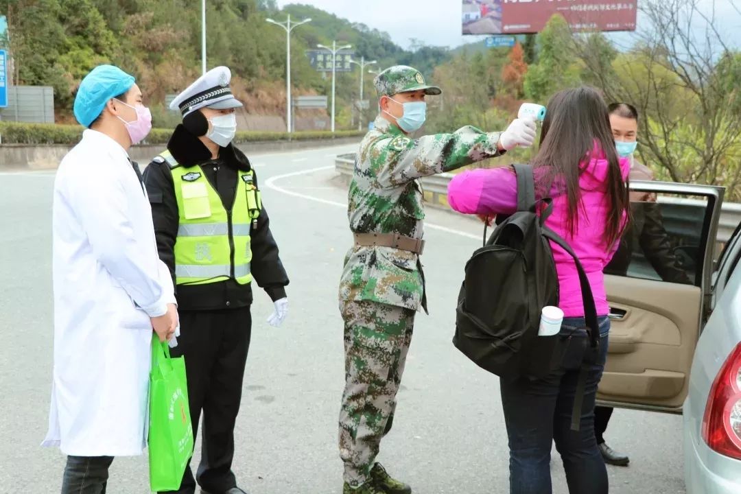 三元公安分局執(zhí)法人員在三明南出口為過(guò)往車(chē)輛人員測(cè)量提問(wèn) 三元區(qū)委文明辦供圖