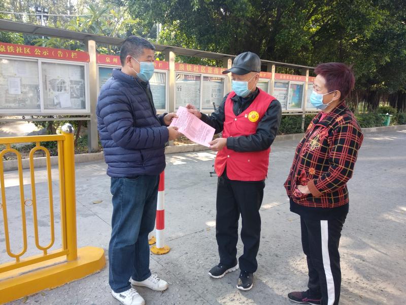 城東街道泉鐵社區(qū)黨支部73歲老黨員施性財同志,放棄春節(jié)返回晉江深滬老家過年,主動加入社區(qū)防控疫情摸排小分隊,開展防控期間各類宣傳,給大家普及疫情防控知識。