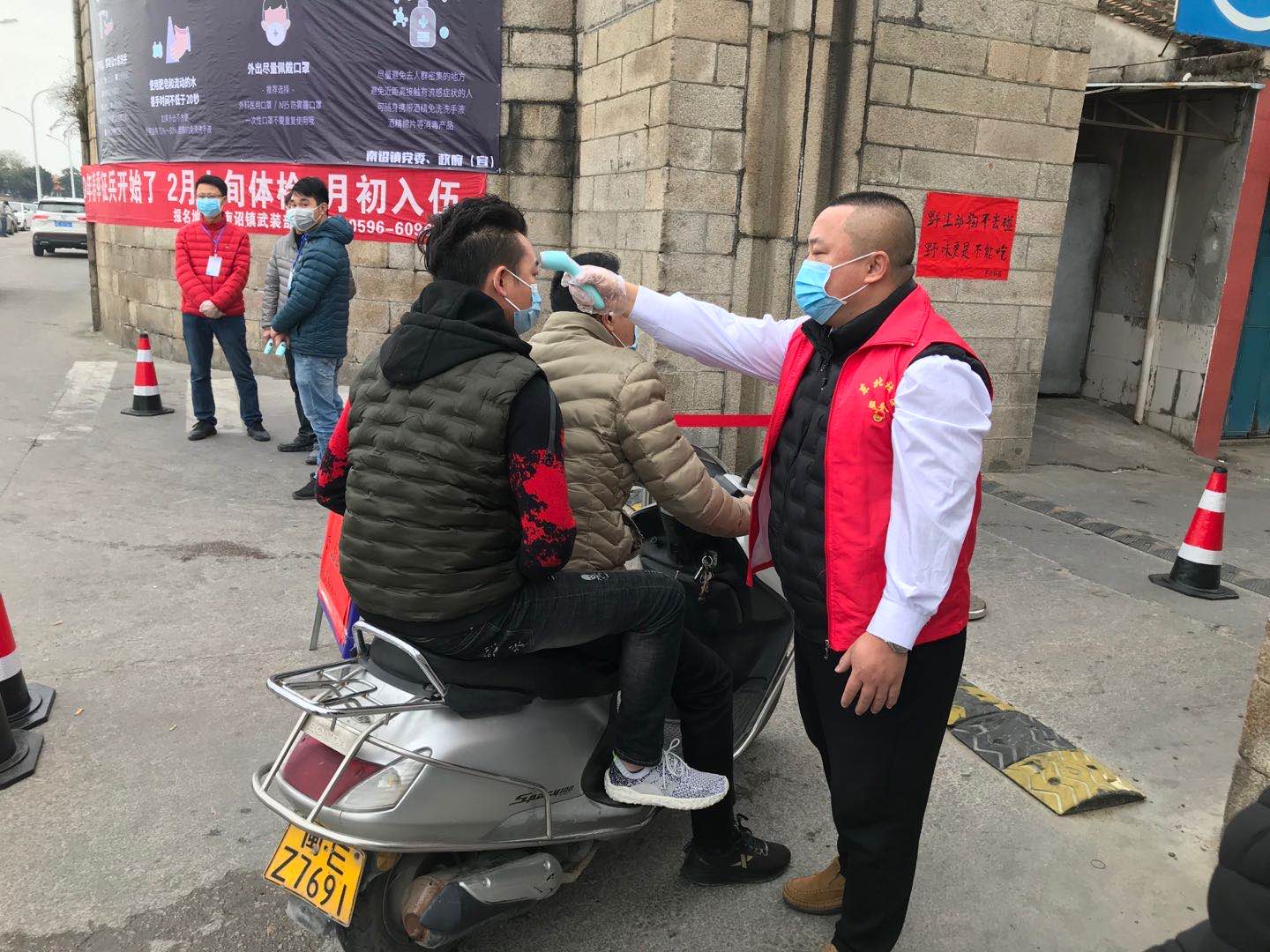 東北社區(qū)志愿者謝海東主動幫助社區(qū)干部為出入人員測體溫 詔安文明辦供圖