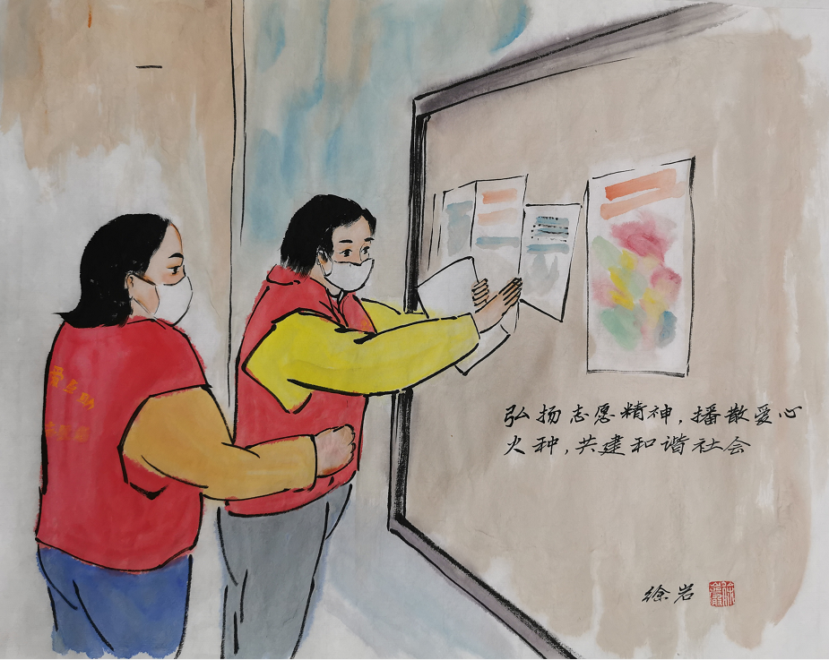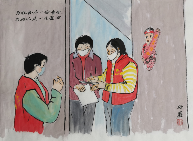 中國鄉(xiāng)土藝術(shù)協(xié)會(huì)傳統(tǒng)文化委員會(huì)主任徐巖先生是支部宣委林淑珍的老師,當(dāng)?shù)弥獙W(xué)生正做為黨員志愿者奮戰(zhàn)在疫情防控一線,徐巖先生有感而發(fā),為田中志愿者欣然揮毫,描繪下他們?nèi)粘Cβ档纳碛?,助力疫情防控宣傳?/p>