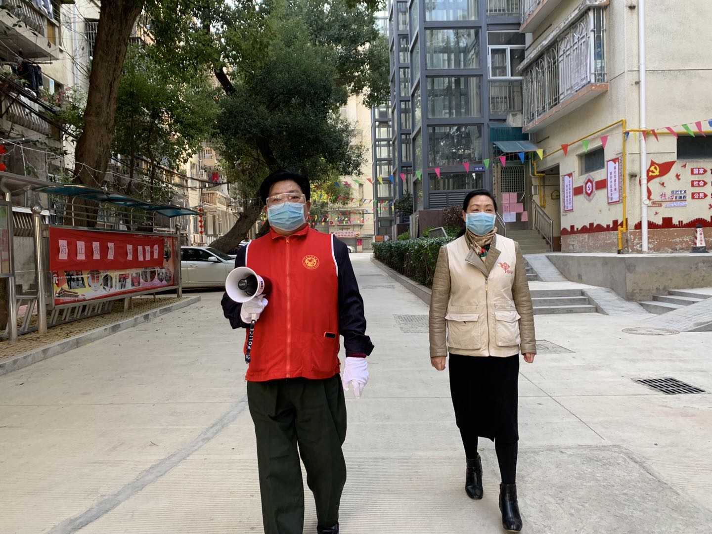 志愿者拿著小喇叭,每天走訪街巷小區(qū)提醒市民防控疫情 鼓樓文明辦供圖