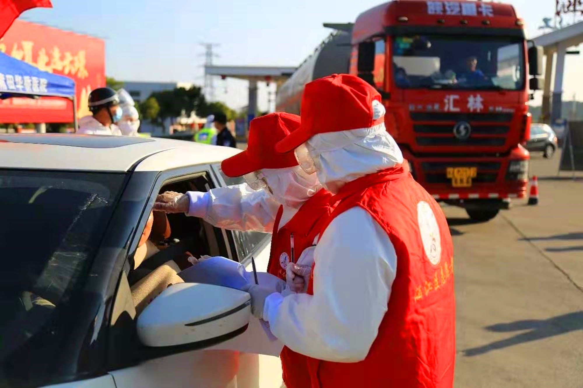 在上崗中,每個卡點的志愿者和警察、醫(yī)護人員都配合默契,協(xié)助引導(dǎo)車輛、測體溫、登記……用無私付出守護著廣大群眾的“健康門”。