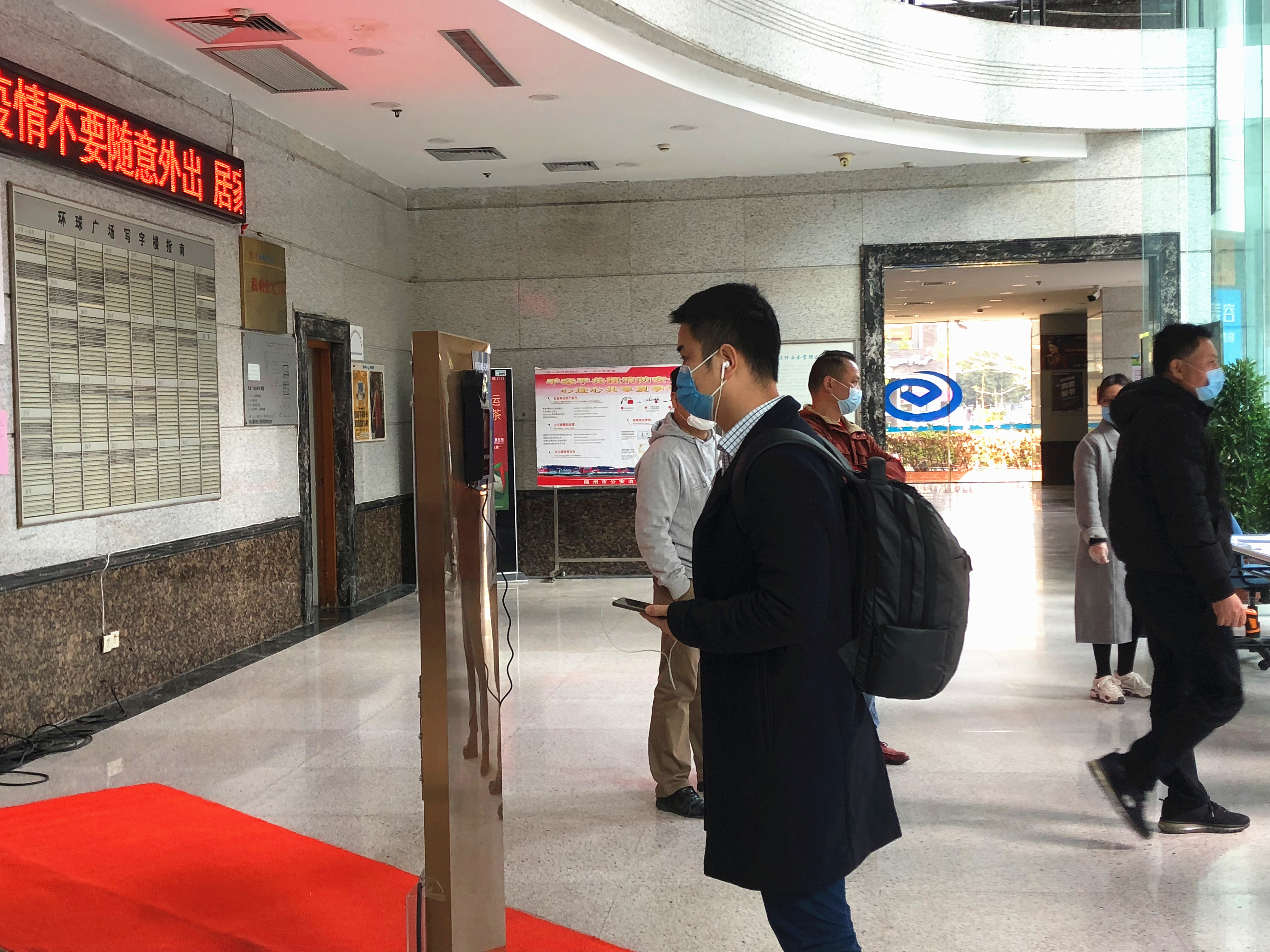 樓宇內(nèi)采用紅外線測溫儀進行把關防疫,助力企業(yè)復工 鼓樓文明辦供圖