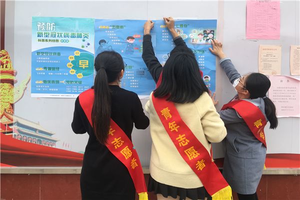 峰市鎮(zhèn)志愿者在張貼宣傳掛圖