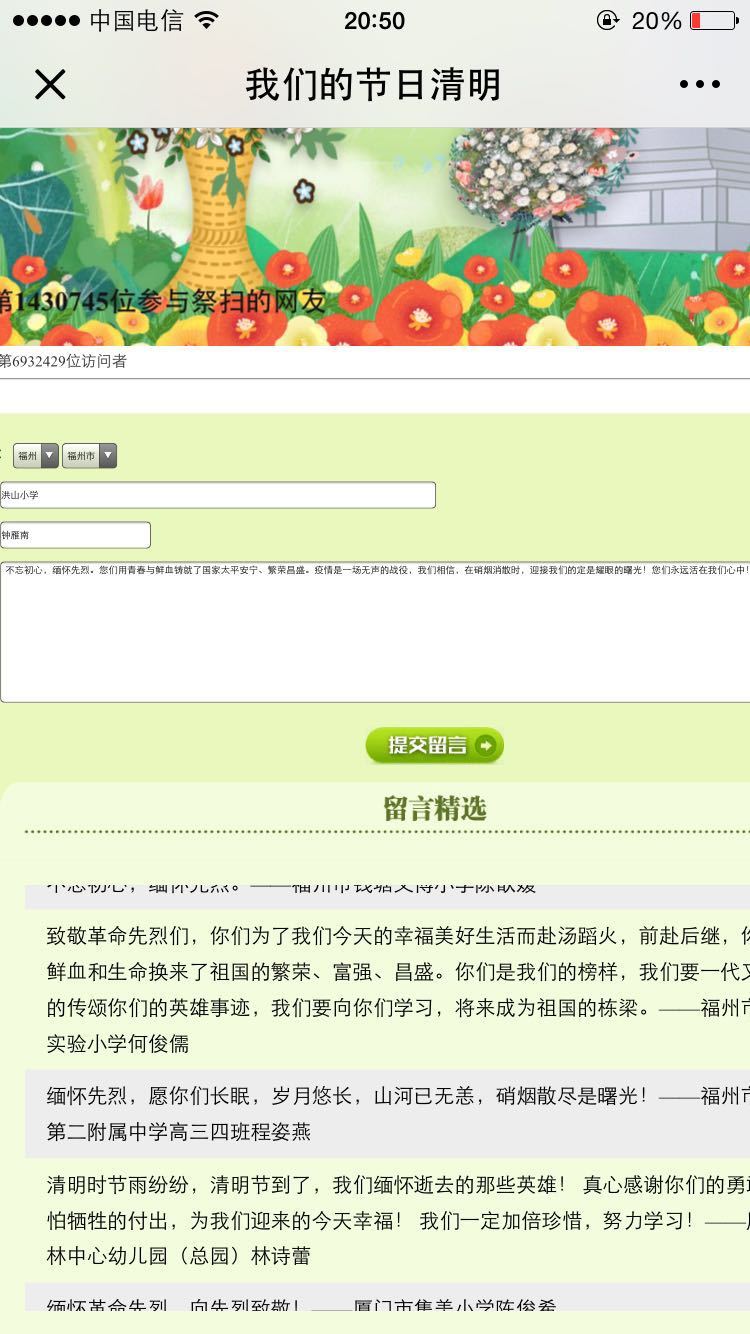 清明節(jié)是中華民族的傳統(tǒng)節(jié)日,為落實(shí)好“扣好人生第一??圩印敝黝}教育實(shí)踐活動(dòng)要求,教育引導(dǎo)廣大青少年傳承紅絲基因、弘揚(yáng)革命精神,鼓樓區(qū)發(fā)動(dòng)各文明校園以清明節(jié)祭祀英烈為契機(jī),結(jié)合抗擊新冠肺炎疫情中的感人事跡,激發(fā)未成人愛國熱情,傳承遺志,奮發(fā)學(xué)習(xí)。4月1日鼓樓區(qū)全體少先隊(duì)員在鼓樓“空中課堂”中集結(jié),在國科大福建學(xué)院附小的紅領(lǐng)巾小主播和輔導(dǎo)員的帶領(lǐng)下,觀看了鼓樓區(qū)委文明辦、鼓樓區(qū)教育局主辦的鼓樓空中微隊(duì)課——我們的節(jié)日·清明《致敬英烈 云上寄思》節(jié)目活動(dòng),全體少年隊(duì)員們學(xué)習(xí)了包含在內(nèi)的 英雄事跡,隨后紛紛在宣誓詞下莊重宣誓。清明節(jié)期間鼓樓區(qū)廣泛發(fā)動(dòng)各中小學(xué)校,積極參與清明祭英烈活動(dòng),組織網(wǎng)上獻(xiàn)花、簽名寄語、制作手抄報(bào)、經(jīng)典誦讀、民俗講解,歌曲傳唱、清明分享會(huì)等多種形式致敬英烈,抒發(fā)對(duì)親人的追思,爭做文明祭祀的引領(lǐng)者,傳統(tǒng)文化的繼承者。