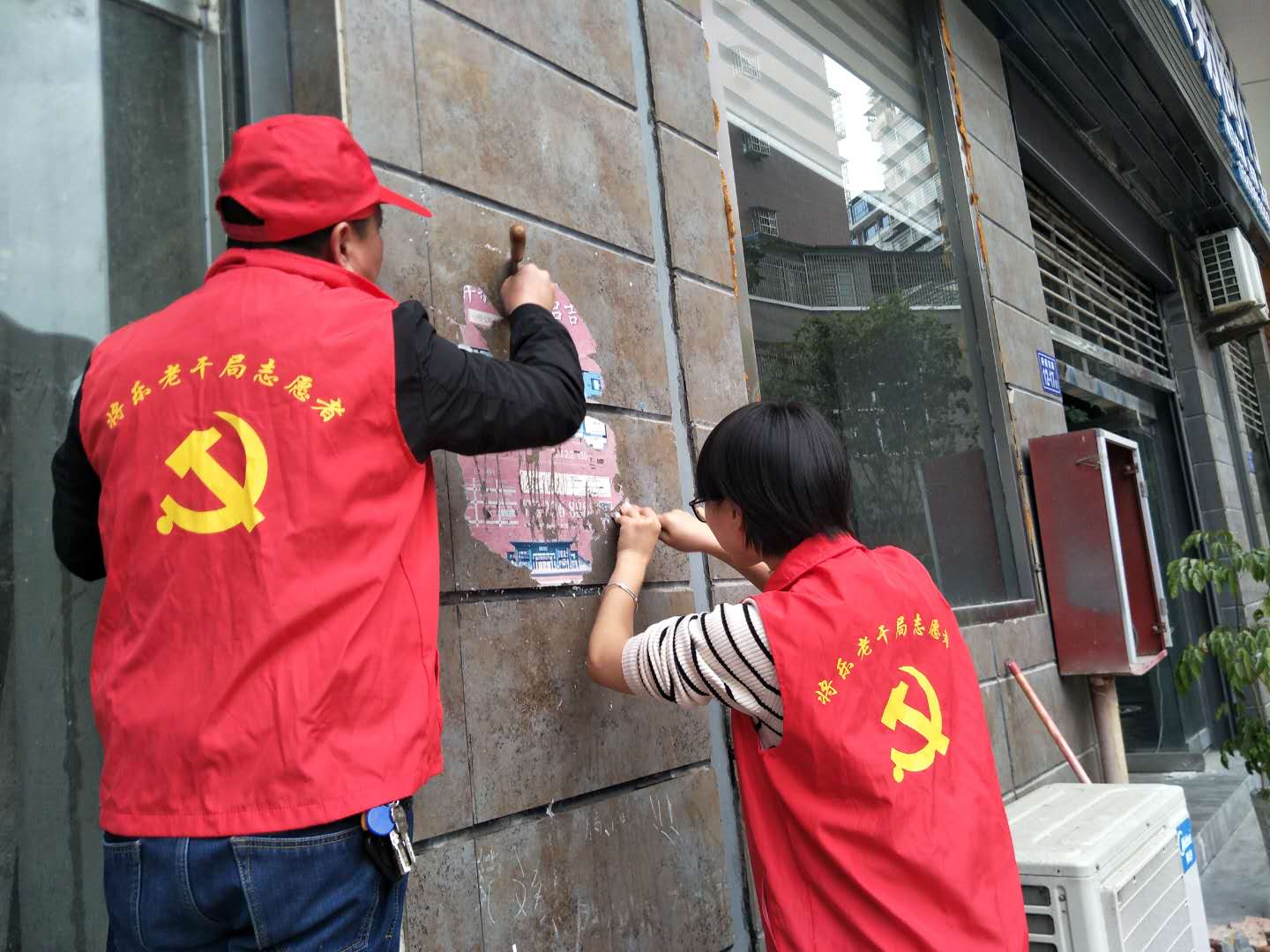 老干局志愿者清理墻面上的小廣告 將樂縣委文明辦供圖