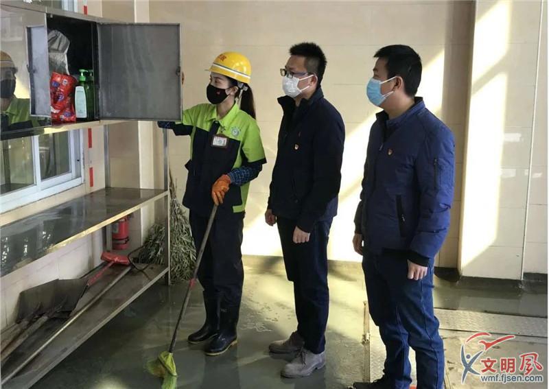 邱鼎胤(左二)檢查各項防疫措施落實情況。(海滄環(huán)衛(wèi)中心供圖)