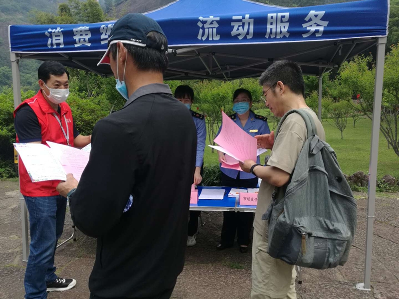 市場(chǎng)監(jiān)管局在武夷山主景區(qū)發(fā)放消費(fèi)維權(quán)宣傳資料 周麗紅 攝