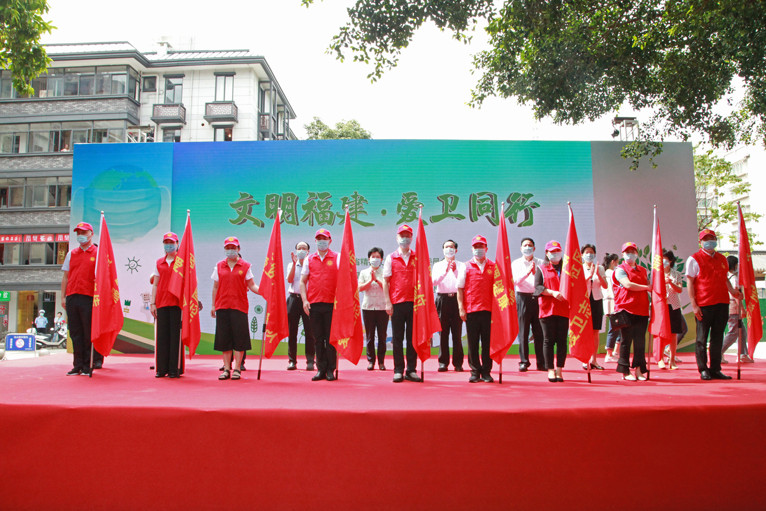現(xiàn)場(chǎng)領(lǐng)導(dǎo)嘉賓為省、市愛(ài)衛(wèi)志愿服務(wù)隊(duì)授旗 福建省衛(wèi)健委孫永杰 攝