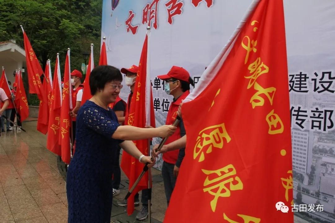 活動(dòng)中,余榕梅給各鄉(xiāng)鎮(zhèn)(街道)志愿服務(wù)隊(duì)授旗。志愿者代表宣讀《文明古田?愛(ài)衛(wèi)同行》倡議書(shū),文明辦代表宣讀《公勺公筷 文明用餐》倡議書(shū)。隨后,志愿者們參觀了宣傳展板并在玉田公園開(kāi)展了環(huán)境衛(wèi)生清理志愿服務(wù)。