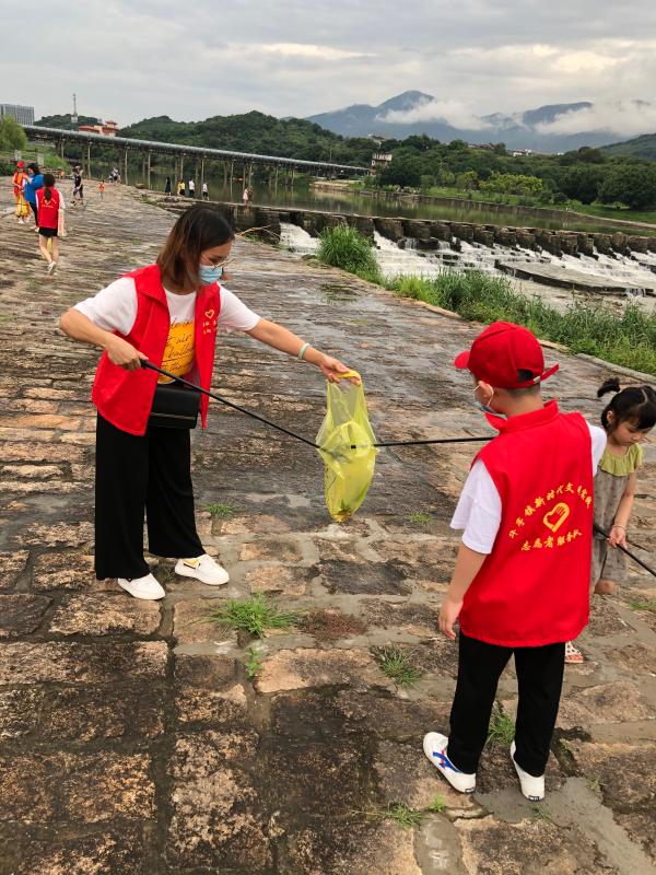 只見木蘭溪河堤邊、草叢中,活躍著該校志愿者們的身影。他們俯身?yè)焓凹埿?、煙頭、塑料袋、飲料瓶等生活垃圾,清理地上的雜草、枯樹枝,用實(shí)際行動(dòng)倡議市民不亂扔垃圾、愛(ài)護(hù)生態(tài)環(huán)境。他們一邊撿垃圾,一邊還不忘向游客們傳遞環(huán)保理念。