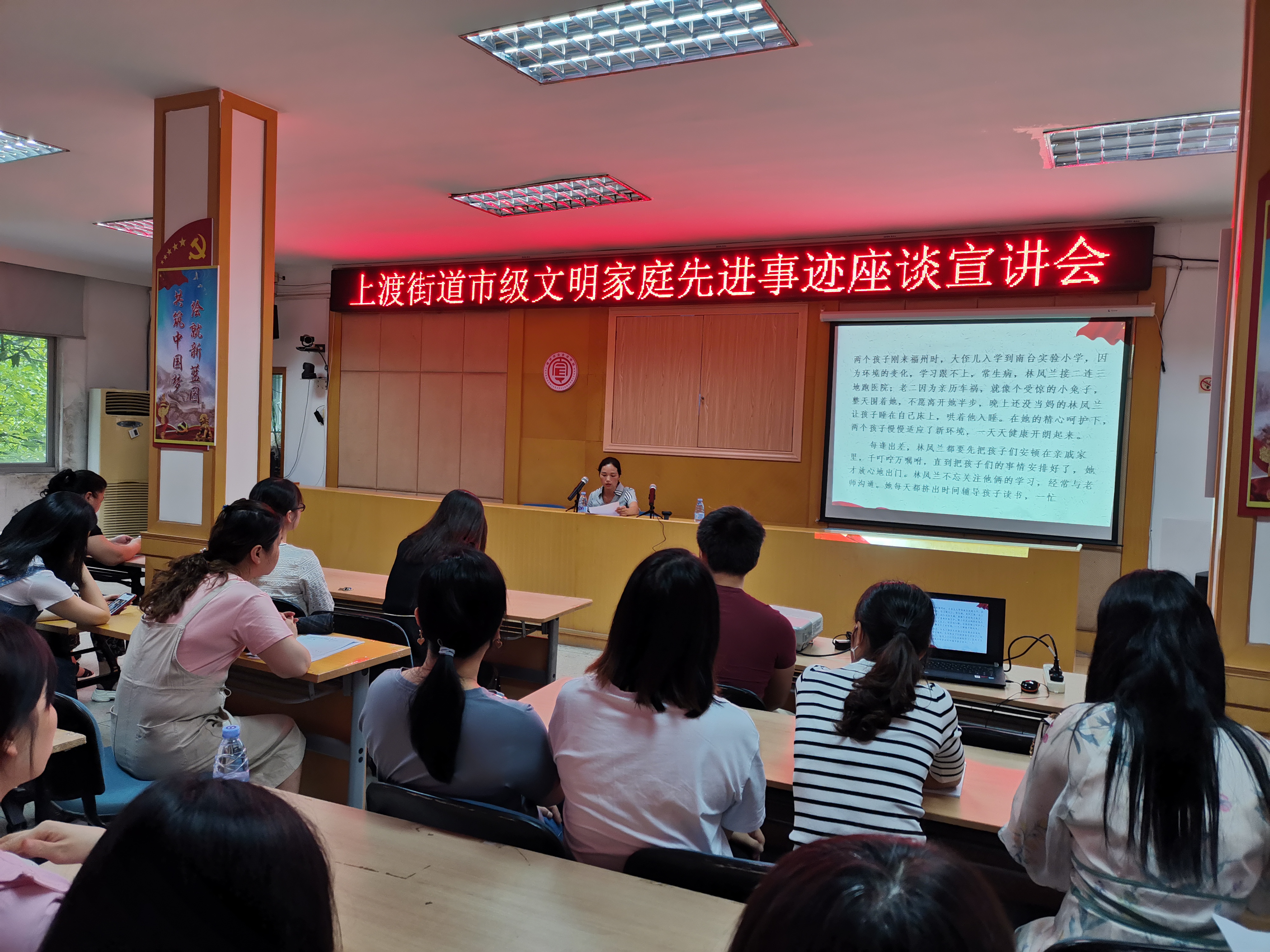 文明風(fēng)6月9日(通訊員吳梅莉)為深入貫徹習(xí)近平總書記系列重要講話精神特別是關(guān)于“注重家庭、注重家教、注重家風(fēng)”重要指示精神,深化家庭文明建設(shè),推動(dòng)在精神文明創(chuàng)建活動(dòng)中深入開展愛國(guó)衛(wèi)生運(yùn)動(dòng),6月9日上午,市級(jí)文明家庭事跡宣傳座談會(huì)暨“抗疫護(hù)家 巾幗不讓須眉”主題宣講活動(dòng)在上渡街道會(huì)議室舉行,活動(dòng)邀請(qǐng)福建省抗疫最美家庭、福州市文明家庭代表林鳳蘭同志進(jìn)行現(xiàn)場(chǎng)座談宣講,街道機(jī)關(guān)干部、各社區(qū)黨員、干部共60余人參加宣講活動(dòng),此外,活動(dòng)還通過“云課堂”平臺(tái)進(jìn)行直播,在云端傳播文明健康知識(shí),超過4000人在線觀看了直播活動(dòng)。