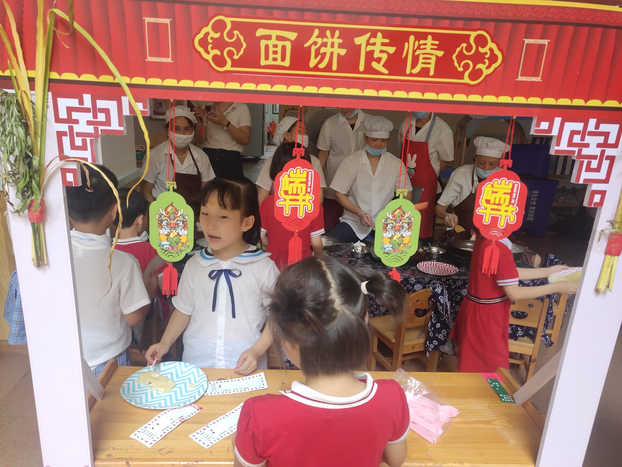 圓圓的面餅,甜甜的味道。端午煎面餅是平潭特有的習俗,小廚神們各顯身手,一張張面餅新鮮出爐。除了會包好吃的粽子,小朋友們還用手工的方式做出了各式各樣的“粽子”,小小粽子,串串紅繩,寄托濃濃端午情。