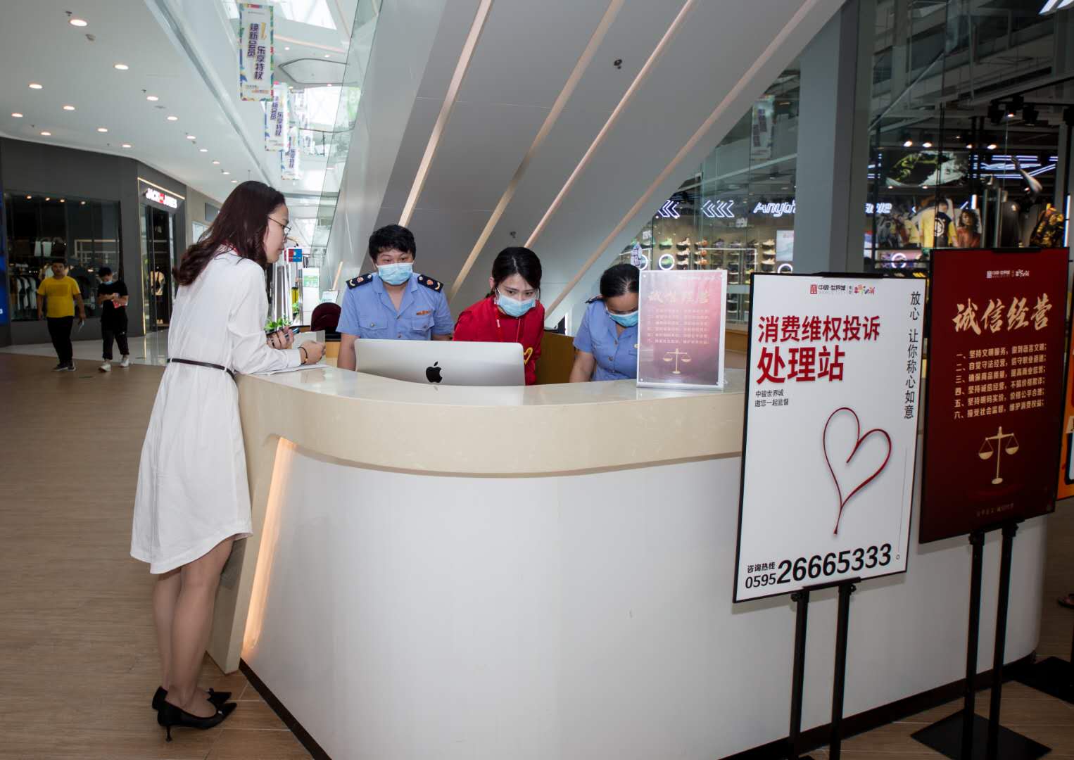 此外,南安中駿·世界城積極建立志愿者服務(wù)站、消費維權(quán)和投訴處理站,建立“一戶一檔”的商戶誠信經(jīng)營檔案制度,記錄商戶信用等級、行政處罰、投訴、榮譽等相關(guān)信息,組織相關(guān)商戶參加規(guī)范經(jīng)營、文明禮儀等培訓(xùn)活動,督促商戶在經(jīng)營過程中亮照經(jīng)營、合法經(jīng)營。今年來,共受理消費者投訴、咨詢件55件,做到事事有回音、件件有回落,7天內(nèi)辦結(jié)率100%。同時,對商場內(nèi)整體購物環(huán)境及商戶內(nèi)部衛(wèi)生店容進行把控,包括公共秩序、店面標(biāo)識規(guī)范、場內(nèi)外景觀綠化、廣場衛(wèi)生等,及時公布誠信經(jīng)營紅黑榜,積極開展各項創(chuàng)建活動。