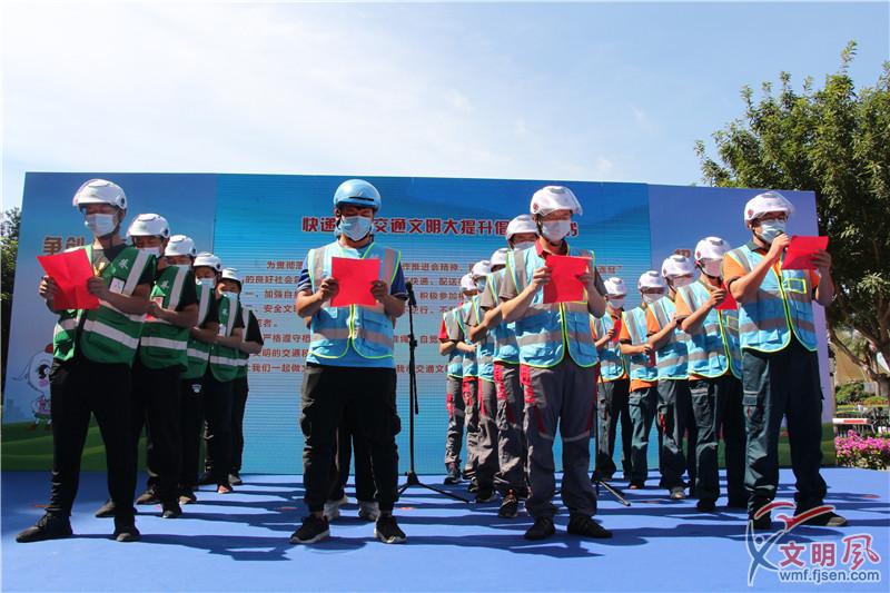 文明交通需要每一位交通參與者的共建?;顒蝇F(xiàn)場,餓了么、京東、樸樸等一線的快遞送餐行業(yè)代表進(jìn)行“遵守交規(guī),文明配送”宣誓?!拔覀円竺總€員工嚴(yán)格遵守‘一盔一帶’,不逆行、不亂闖、不亂停亂放”,“餓了么”鷺江道站長夏飛告訴記者,每天組織學(xué)習(xí)交通安全制度法規(guī)是必修課,身在快遞行業(yè),要為廈門文明安全的交通秩序出一份力。
