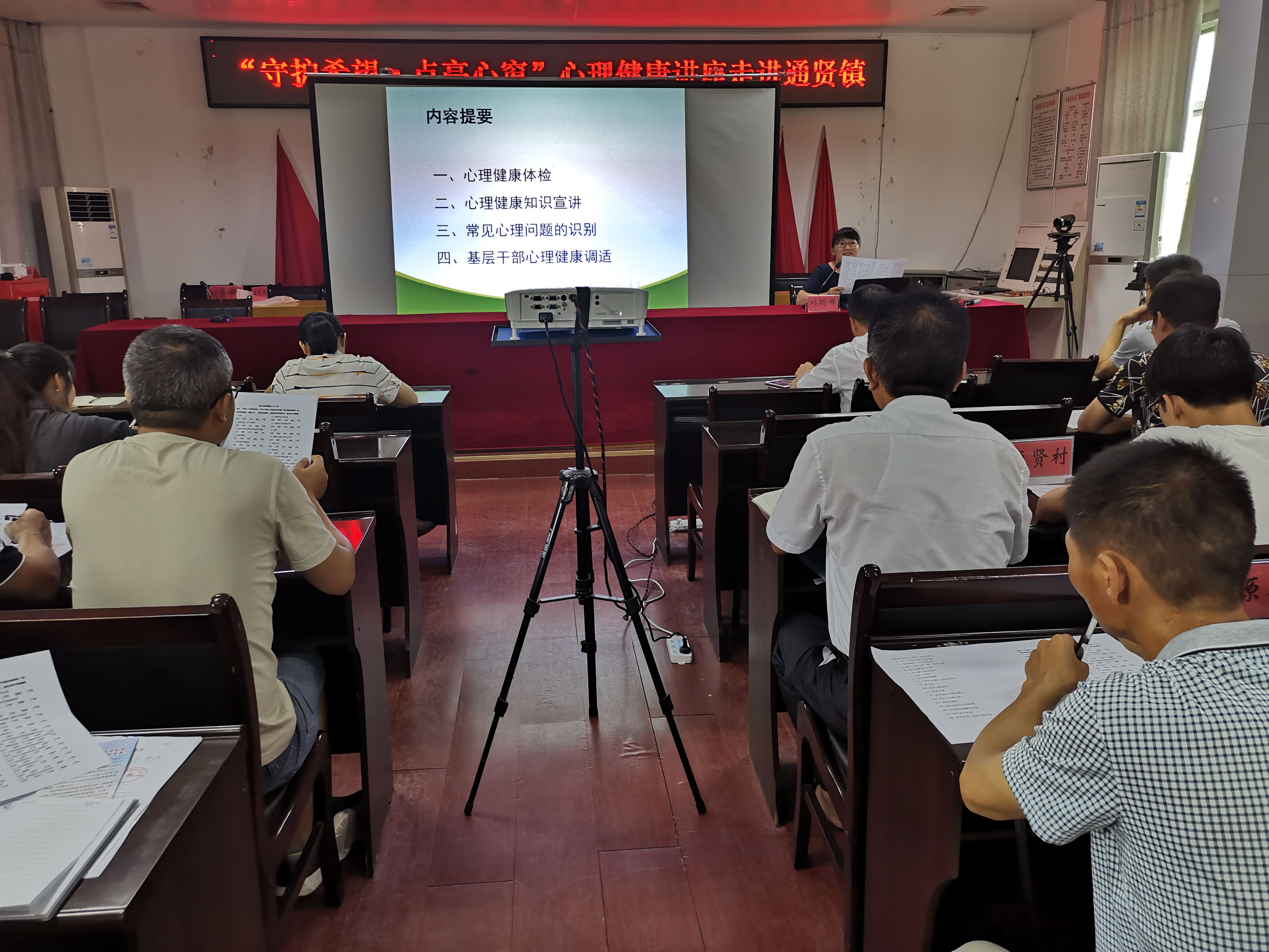 講座中,劉聰娣老師先對現(xiàn)場的鎮(zhèn)村干部進行心理健康體檢和心理壓力測試;然后對心理健康標(biāo)準(zhǔn)、心理健康素養(yǎng)十條,精神衛(wèi)生與心理健康核心知識20問等心理健康知識進行解讀,并結(jié)合具體的案例說明如何識別焦慮、強迫、抑郁等常見的心理問題;最后闡述了基層干部心理自我調(diào)適和組織調(diào)適的一般方法。講座后,劉老師還對心理測試情況進行數(shù)據(jù)統(tǒng)計和分析,建立鎮(zhèn)村干部的心理健康檔案。