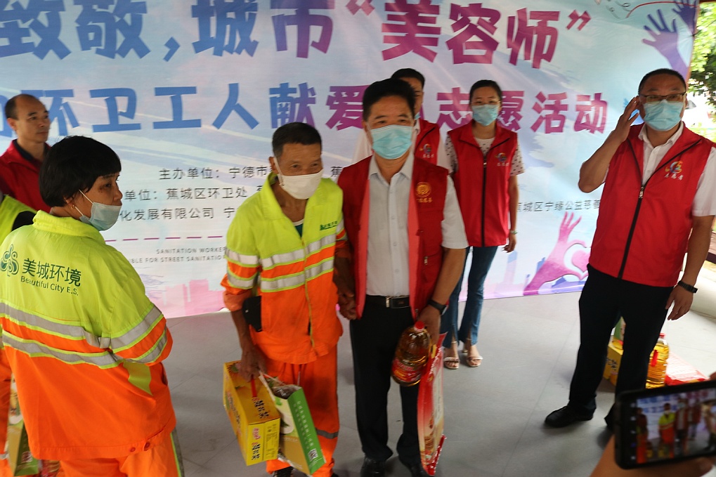 “你們是城市的美容師,為寧德創(chuàng)建全國文明城市作出巨大貢獻(xiàn),你們辛苦了!”活動(dòng)中,蕉南街道志愿者與愛心單位細(xì)心為每一位環(huán)衛(wèi)工人送上涼茶、大米、食用油等慰問品,并叮囑他們天氣炎熱,要注意避暑。