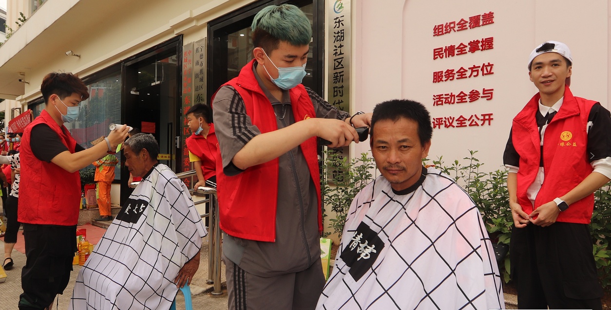 志愿者為環(huán)衛(wèi)工人義務(wù)理發(fā)(來源:寧德晚報(bào))