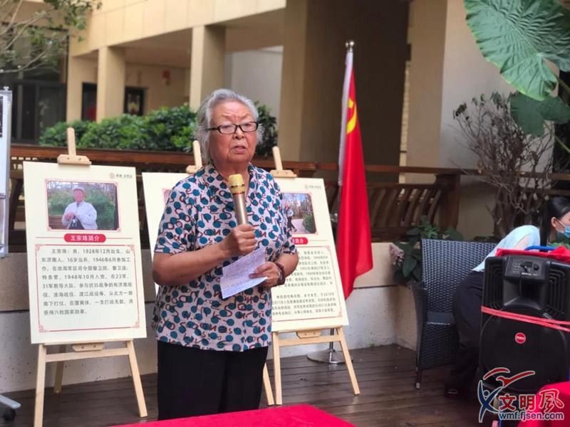 活動現(xiàn)場,養(yǎng)老院的長者林流芳向大家講述了上甘嶺戰(zhàn)役及抗美援朝的故事。1949年,15歲的林流芳在她的家鄉(xiāng)龍巖新羅鎮(zhèn)參加了閩粵贛邊區(qū)游擊縱隊的文工團,成為一名文藝戰(zhàn)士。1953年,在華東野戰(zhàn)軍藝術(shù)劇院的林流芳被抽調(diào)加入中國人民志愿軍第九兵團文工團,前往抗美援朝前線。她為大家再現(xiàn)了共產(chǎn)黨員的革命意志和奮斗精神,通過有思想、有溫度、有情懷、有力量的紅色故事,引導(dǎo)廣大黨員、老人孩子熱愛祖國,增強黨性。