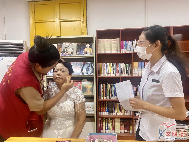 活動中,前來拍照的夫婦有序排隊。帶著老伴前來的周阿姨說:“在我們那個年代都沒有拍結(jié)婚照,如今年紀大了也不好意思去婚紗店拍。現(xiàn)在大家都來了,就沒什么不好意思的了,感謝黨的好政策。” 在等待拍攝的過程中,老人們還情不自禁地講述起了各自的愛情故事。老人們在柴米油鹽、衣食住行這些瑣碎的平凡生活中相濡以沫,但可貴的是忠貞與堅持,這也是老人們想要傳遞給年輕一代的夫妻之道。