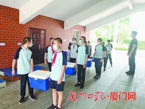 每天,佩戴紅袖章的學(xué)生志愿者,輪流上崗,參與配餐流程,并進(jìn)行現(xiàn)場(chǎng)規(guī)勸,將浪費(fèi)降到最低。(蔡塘學(xué)校提供)