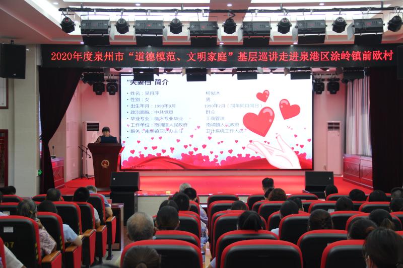 文明風(fēng)8月20日訊(通訊員陳燕燕)文明之行,德耀泉州。8月19日下午, 2020年度泉州市“道德模范、文明家庭”基層巡講走進(jìn)泉港區(qū)涂嶺鎮(zhèn)前歐村活動(dòng)在前歐村文明禮堂舉行,泉港區(qū)委宣傳部、區(qū)委文明辦、區(qū)婦聯(lián)、南埔鎮(zhèn)、涂嶺鎮(zhèn)、山腰鹽場(chǎng)、公安分局分管領(lǐng)導(dǎo),公安分局干部、涂嶺鎮(zhèn)村干等100余人參加。