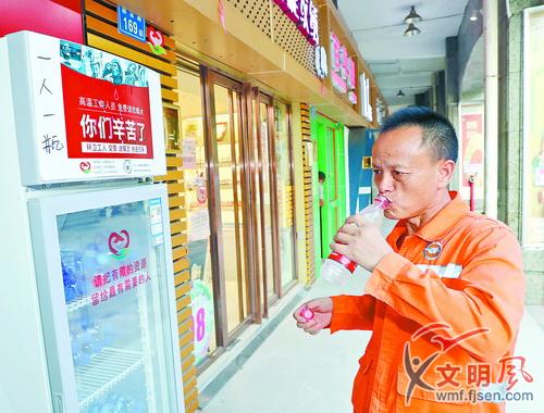 環(huán)衛(wèi)工人正在“愛(ài)心冰箱”取水飲用。江頭街道供圖