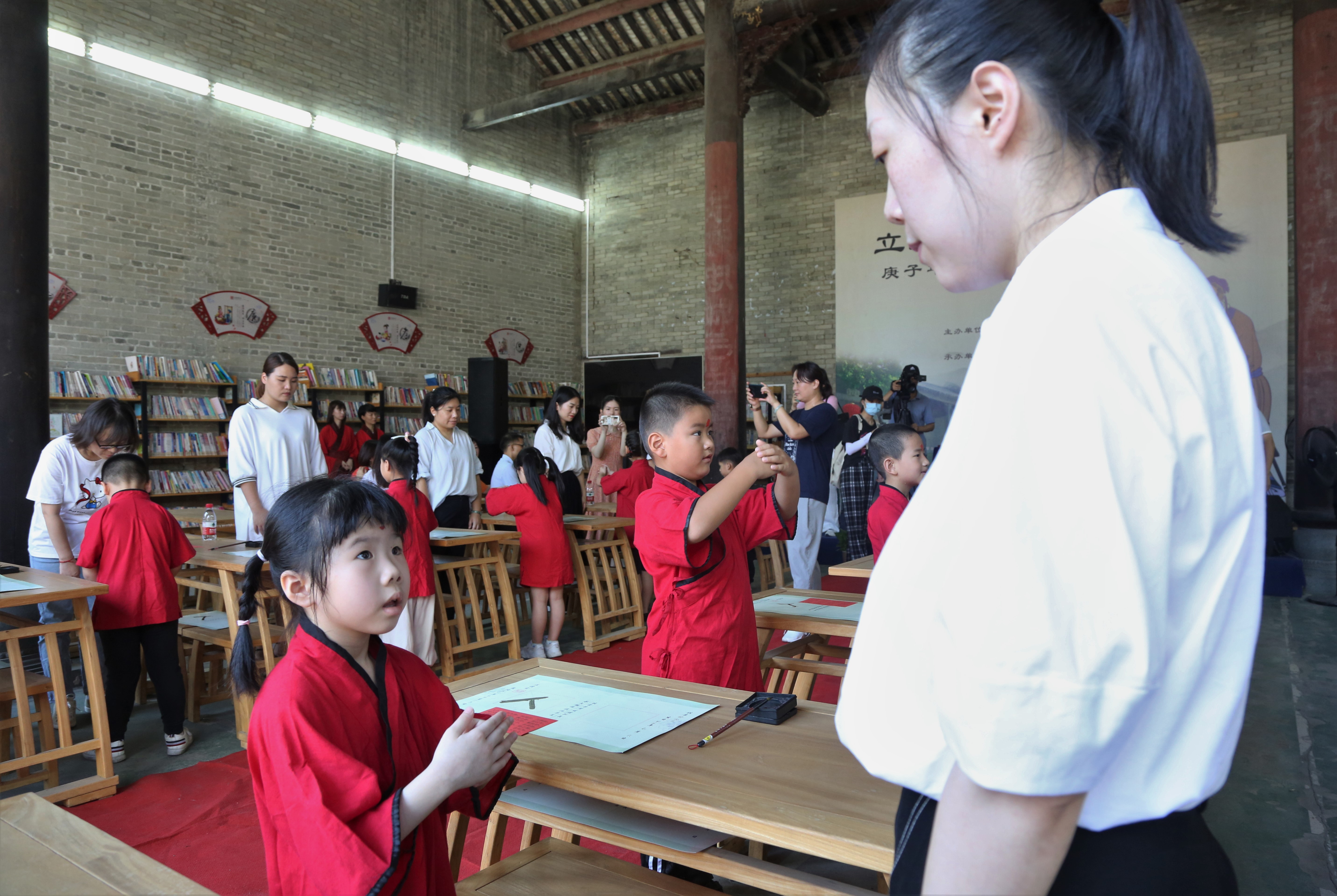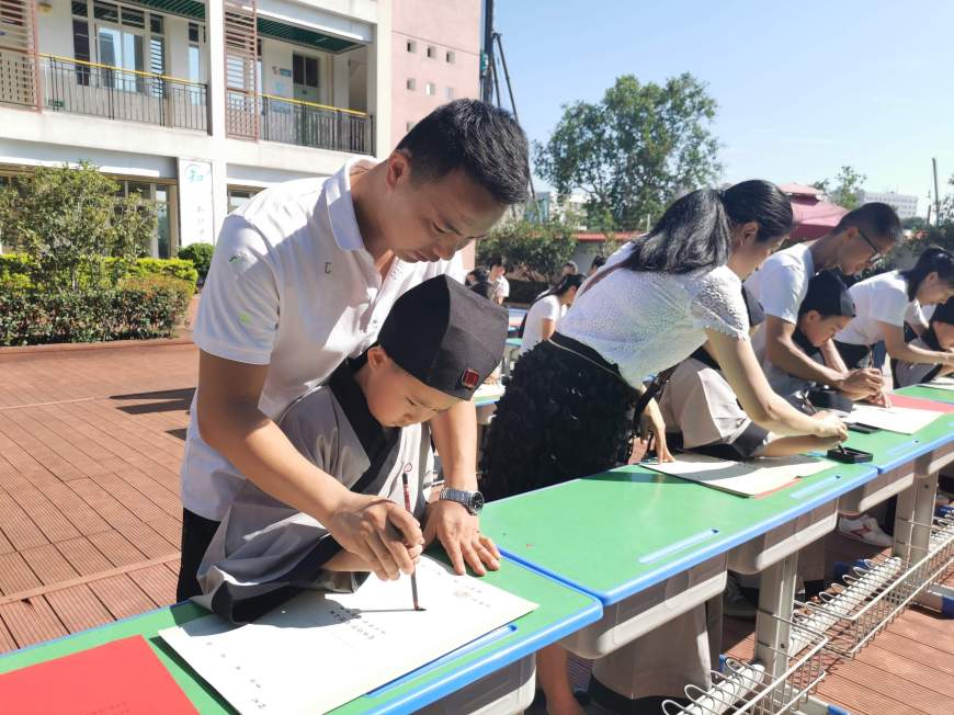 活動現(xiàn)場分別進行了:“漢服迎賓”、“行盥洗禮”、“拜師禮”、“正衣冠”、“朱砂啟智”、“擊鼓明志”、“啟蒙描紅”、“授章正禮”、“吟誦國學”、“開筆訓言”、“感恩父母”等11個儀式。