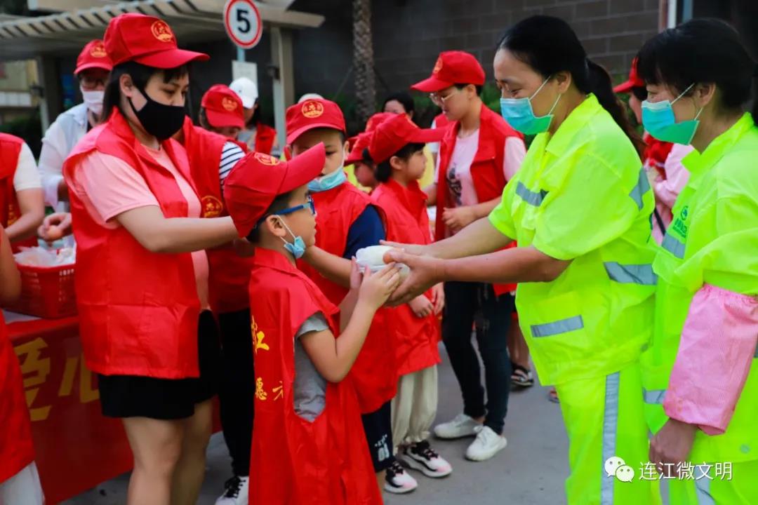 8月31日清晨5點(diǎn)整,天還未亮,連江街頭出現(xiàn)這樣一行人,他們身著統(tǒng)一的志愿服裝,早早趕到位于城東白沙路的一家愛心美食坊。“大家抓緊時(shí)間把早餐領(lǐng)走,早點(diǎn)送到環(huán)衛(wèi)工人手上,要不然時(shí)間久了就涼了。”愛心美食坊負(fù)責(zé)人余燕芳和連江學(xué)雷鋒親子志愿隊(duì)黃鈺招呼著大家,麻利地將150份早餐分配到50名大小志愿者手中,簡單交代一下注意事項(xiàng)后,大家兵分兩路,分別驅(qū)車,開始給環(huán)衛(wèi)工送去?!鞍⒁蹋銈冃量嗔?,我們給你送早餐來了?!?點(diǎn)15分,余燕芳帶領(lǐng)著孩子們將一份份還冒著熱氣的早餐,恭恭敬敬地送到環(huán)衛(wèi)工人手中。