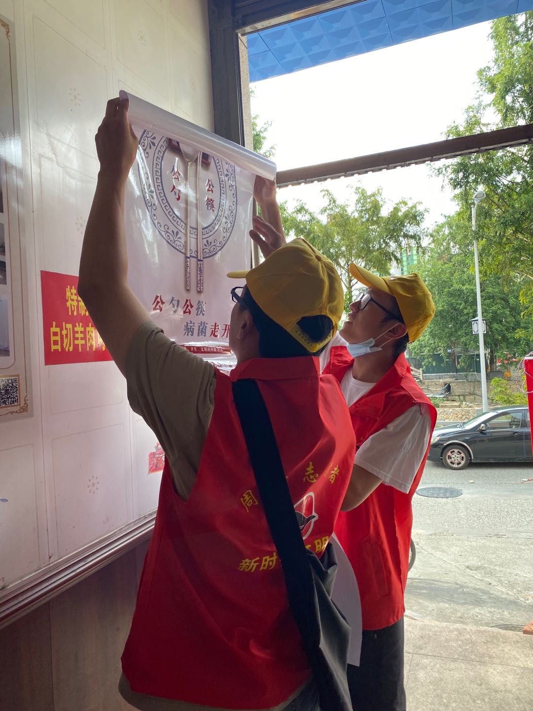 志愿者在餐飲店張貼“文明餐桌”海報 周寧縣文明辦供圖