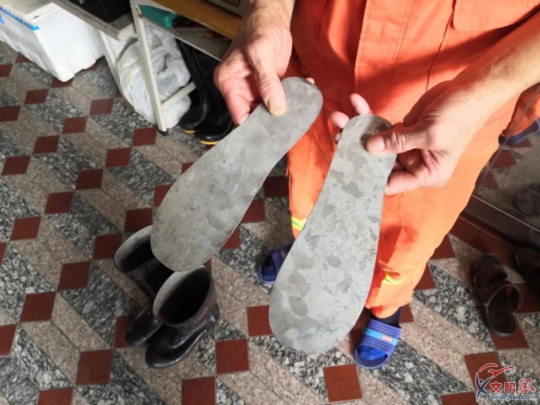 實(shí)際上,對(duì)于已經(jīng)63歲的莊建全來說,踩垃圾桶是一件十分危險(xiǎn)的事情,這不僅需要較強(qiáng)的平衡感,被垃圾桶內(nèi)的玻璃和竹簽中傷也是常有的事情,雖然一年四季都穿著雨鞋,但還是有“頑強(qiáng)”的竹簽子會(huì)穿透雨鞋刺傷腳底,無奈之下,莊建全只好找來鐵片,按著鞋墊的模樣,自制了一雙鐵片鞋墊。