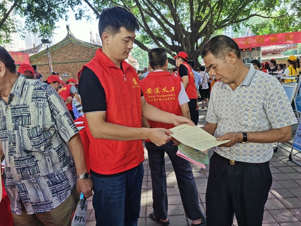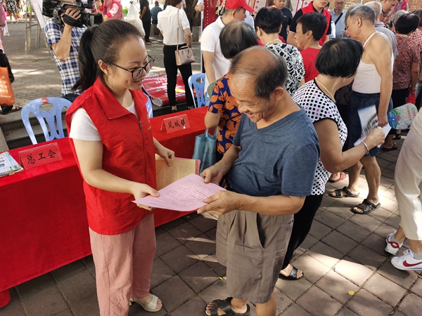 志愿者向群眾發(fā)放相關宣傳材料。黃珊珊 供圖