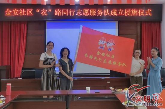 授旗儀式上,金安社區(qū)黨委副書記、居委會(huì)主任陳惠萍宣布了由骨干志愿者們民主選舉出的隊(duì)長(zhǎng)與副隊(duì)長(zhǎng)名單,并為“衣”路同行志愿服務(wù)隊(duì)授旗,宣布衣路同行志愿服務(wù)隊(duì)伍正式成立。