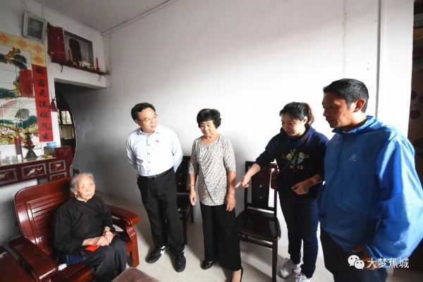 姚錫鈴一行來到飛鸞鎮(zhèn),為老年人們送去節(jié)日的祝福以及黨和政府的關(guān)懷。每到一處,姚錫鈴都與百歲老人親切交流,詢問老人吃住情況。