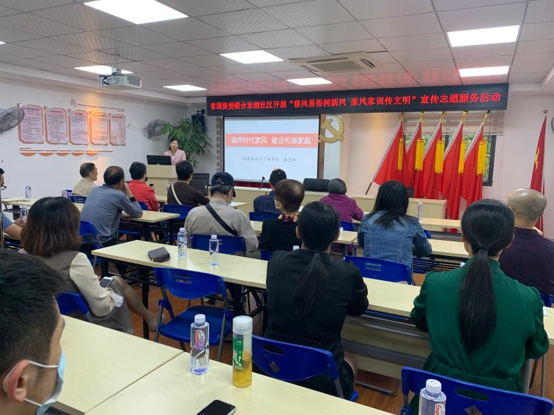 文明風(fēng)10月29日訊(通訊員鄭夢玲)為進(jìn)一步弘揚社會主義核心價值觀,落實黨建+聯(lián)盟單位機制,積極促進(jìn)社區(qū)新時代文明實踐站建設(shè),抓好移風(fēng)易俗工作,推動精神文明建設(shè)落深落細(xì)落實,近日,鼓樓區(qū)溫泉街道東湖社區(qū)聯(lián)合黨建聯(lián)盟單位福建省國資委開展“移風(fēng)易俗樹新風(fēng) 家風(fēng)家訓(xùn)傳文明”志愿宣講活動。省國資委機關(guān)各處(室、部)代表、東湖社區(qū)干部及群眾代表共30余人參加了本次活動。