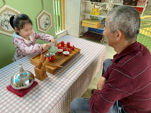 安溪十幼的小朋友向長(zhǎng)輩獻(xiàn)菊花茶。吳小燕 供圖