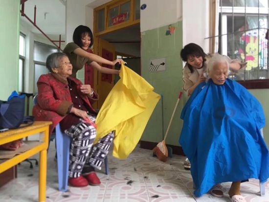 林劍涵和員工為老人剪發(fā)。(湖里區(qū)委文明辦供圖)
