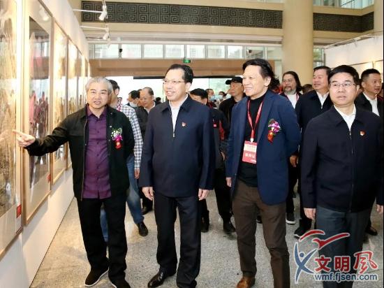 漳州市領(lǐng)導(dǎo)邵玉龍、劉遠(yuǎn)、阮開森、張琳光、劉偉澤、方木榮、林曉東、楊勝華,市法院院長羅雄、市檢察院檢察長黃秀強(qiáng),著名書畫家王來文、滿維起,市直有關(guān)部門負(fù)責(zé)人等參加開幕式。市委書記邵玉龍宣布書畫展開幕,市委副書記、政法委書記阮開森及書畫家代表王來文、滿維起在開幕式上致辭,羅雄主持開幕式。