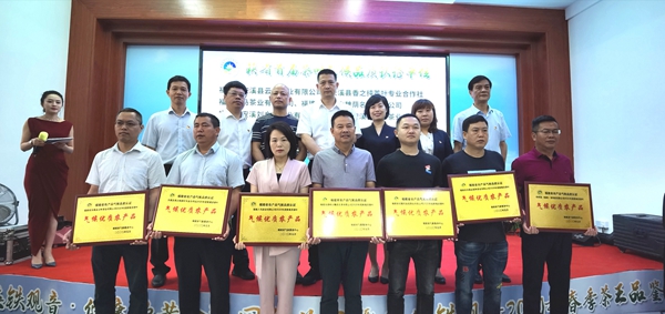 省、市、縣相關領導為茶企頒發(fā)“茶葉氣候品質(zhì)認證牌匾和證書”。安溪氣象局 供圖