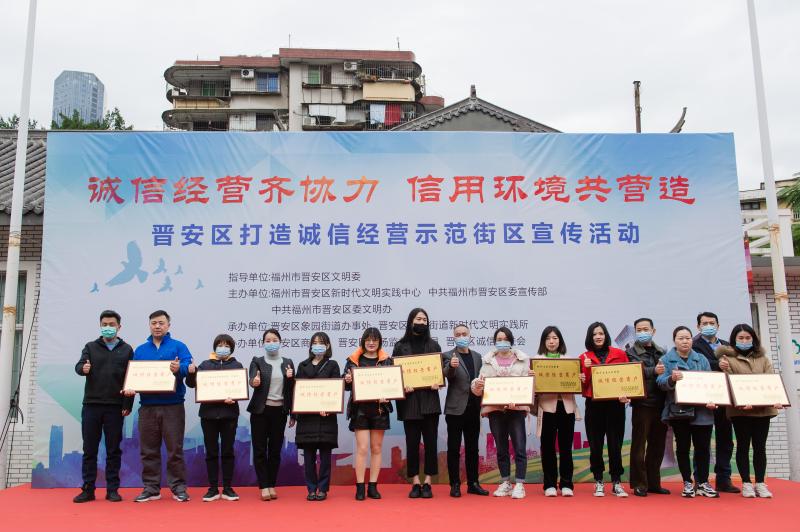 晉安區(qū)有關(guān)部門授予世歐廣場10家誠信商戶代表“誠信經(jīng)營商戶”牌匾 晉安區(qū)委文明辦供圖