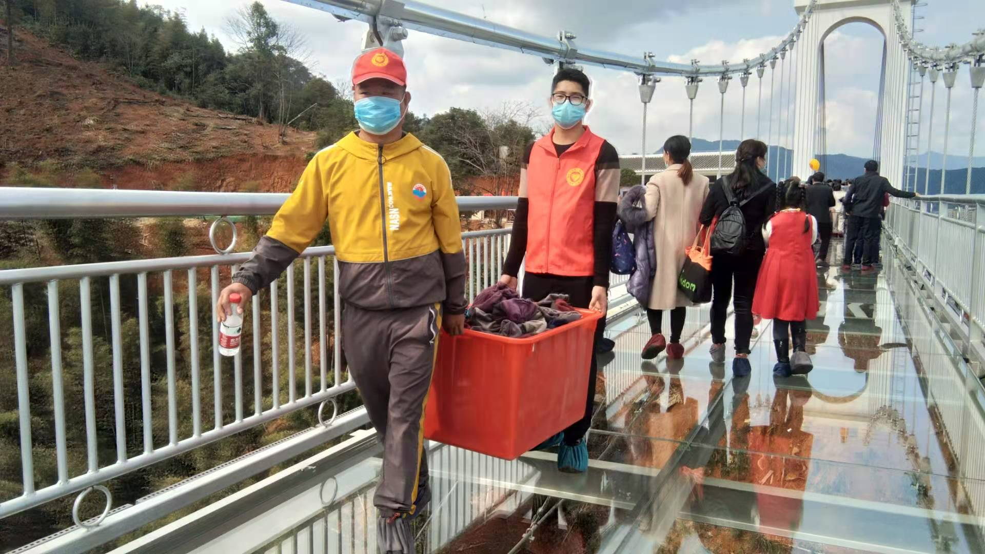 “請(qǐng)戴好口罩?!薄罢?qǐng)出示健康碼。”“請(qǐng)穿好鞋套往下走”……連日來(lái),在云際山風(fēng)景區(qū)各入口、玻璃懸索橋上,由市委文明辦、團(tuán)市委招募的文明勸導(dǎo)志愿者在人流如潮的景點(diǎn)忙著,為市民開(kāi)心、舒適、安全、有序游玩發(fā)揮了積極作用。
