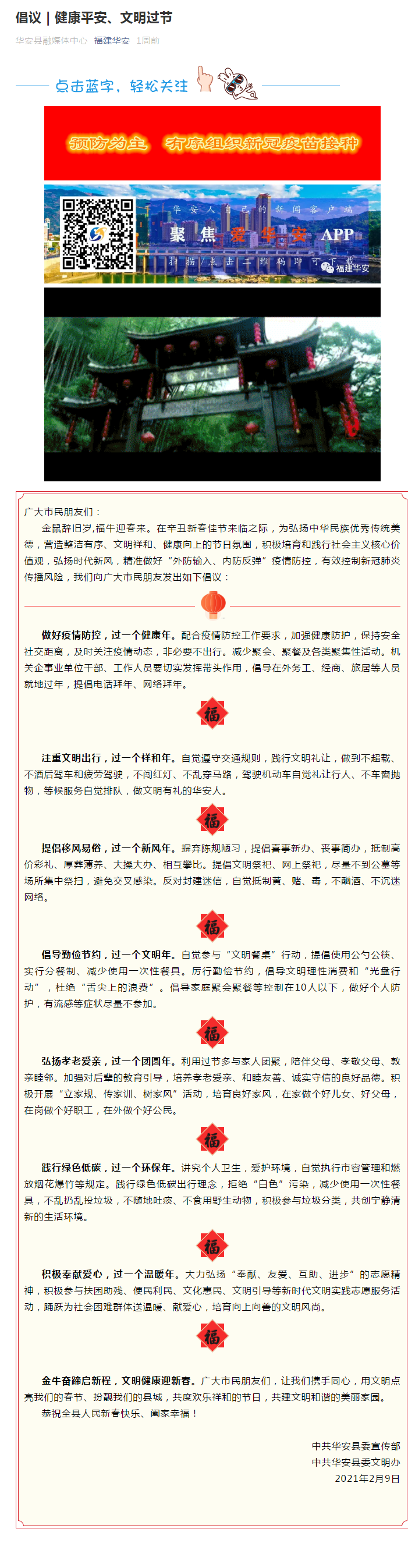 春節(jié)前夕,華安縣委宣傳部、文明辦利用“微信華安公眾號”發(fā)布《健康平安 文明過節(jié)》倡議書,動員全縣各鄉(xiāng)鎮(zhèn)、各單位、各社區(qū)、村居和學(xué)校廣泛轉(zhuǎn)發(fā),讓疫情防控工作深入人心。