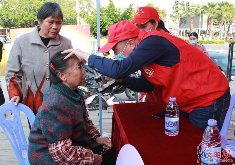 志愿者對(duì)老人進(jìn)行視力檢查。夏菁 攝