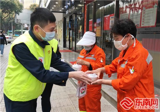 志愿者為環(huán)衛(wèi)工人們送上暖心湯圓(集美·誠毅志愿者聯(lián)盟供圖)