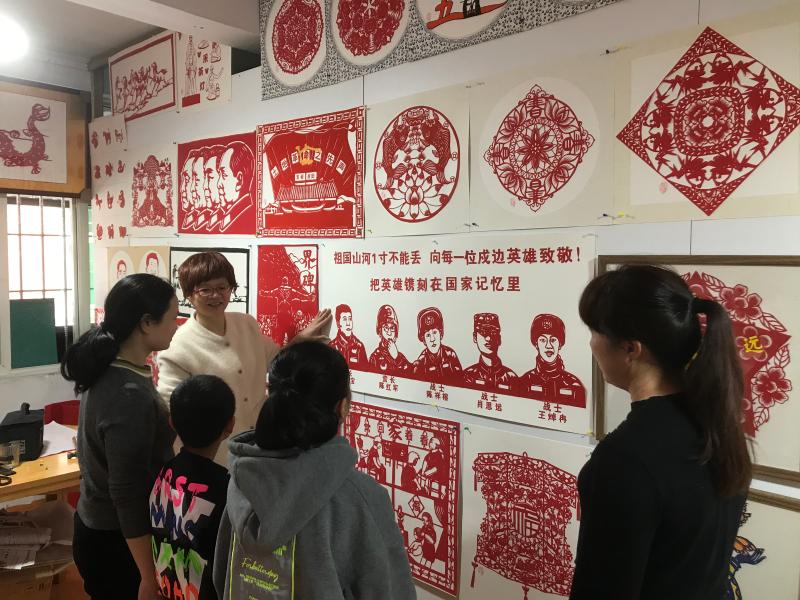 林紅纓剪紙工作室最顯眼的位置上,放著兩幅她精心剪制的5位衛(wèi)國戍邊英雄剪影,并附文:“祖國山河一寸不能丟,向每一位戍邊英雄致敬!把英雄鐫刻在國家記憶里”,此舉受到了前來工作室參訪群眾的稱贊。