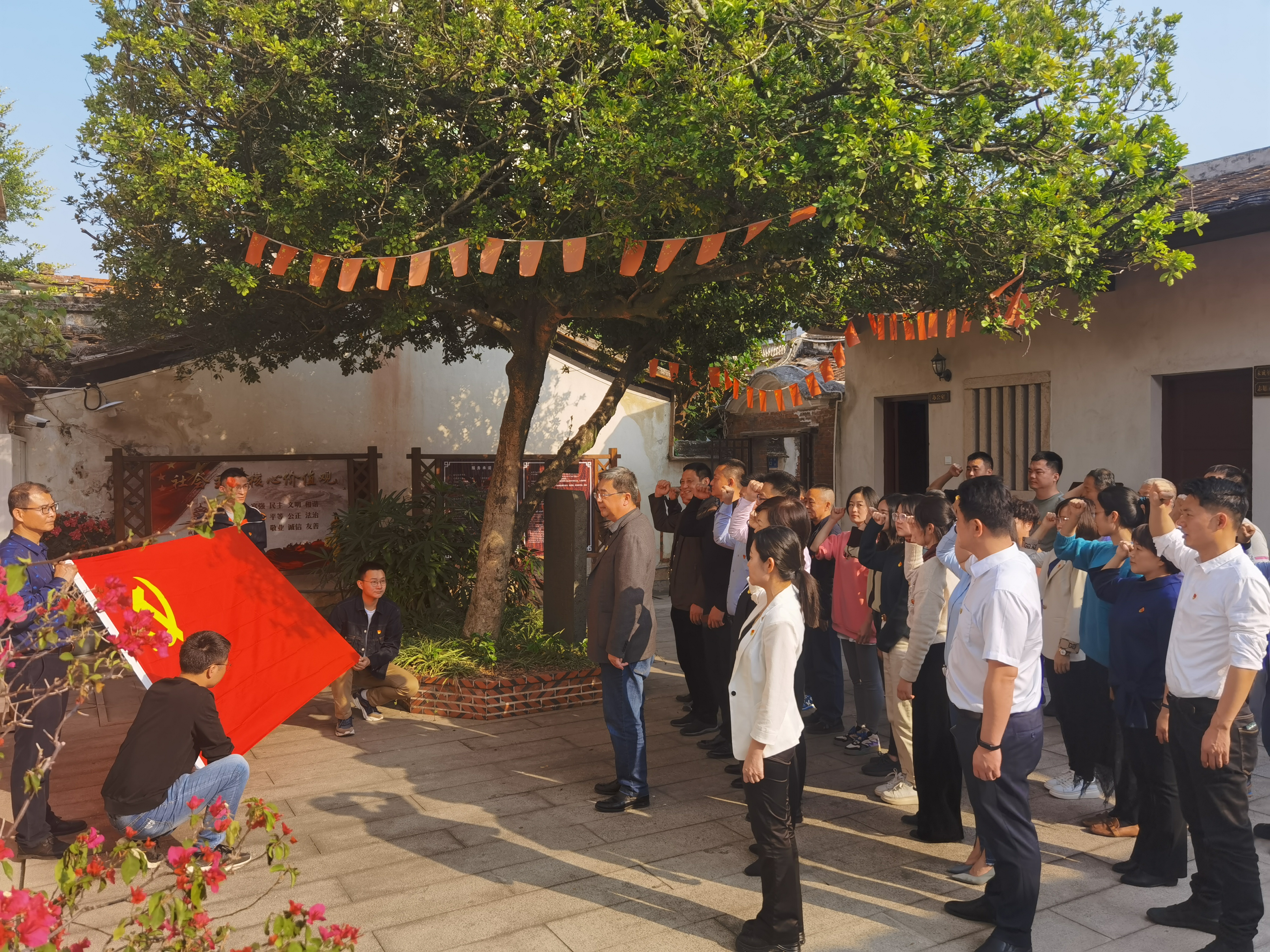 “我志愿加入中國共產(chǎn)黨,擁護黨的綱領(lǐng),遵守黨的章程,履行黨員義務(wù),執(zhí)行黨的決定,嚴守黨的紀律,保守黨的秘密,對黨忠誠,積極工作,為共產(chǎn)主義奮斗終身,隨時準備為黨和人民犧牲一切,永不叛黨?!痹谥泄哺=ㄅR時省委舊址,薌城區(qū)宣傳系統(tǒng)黨員們面向黨旗,重溫入黨誓詞。